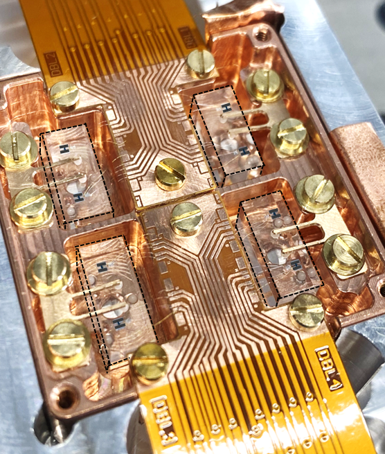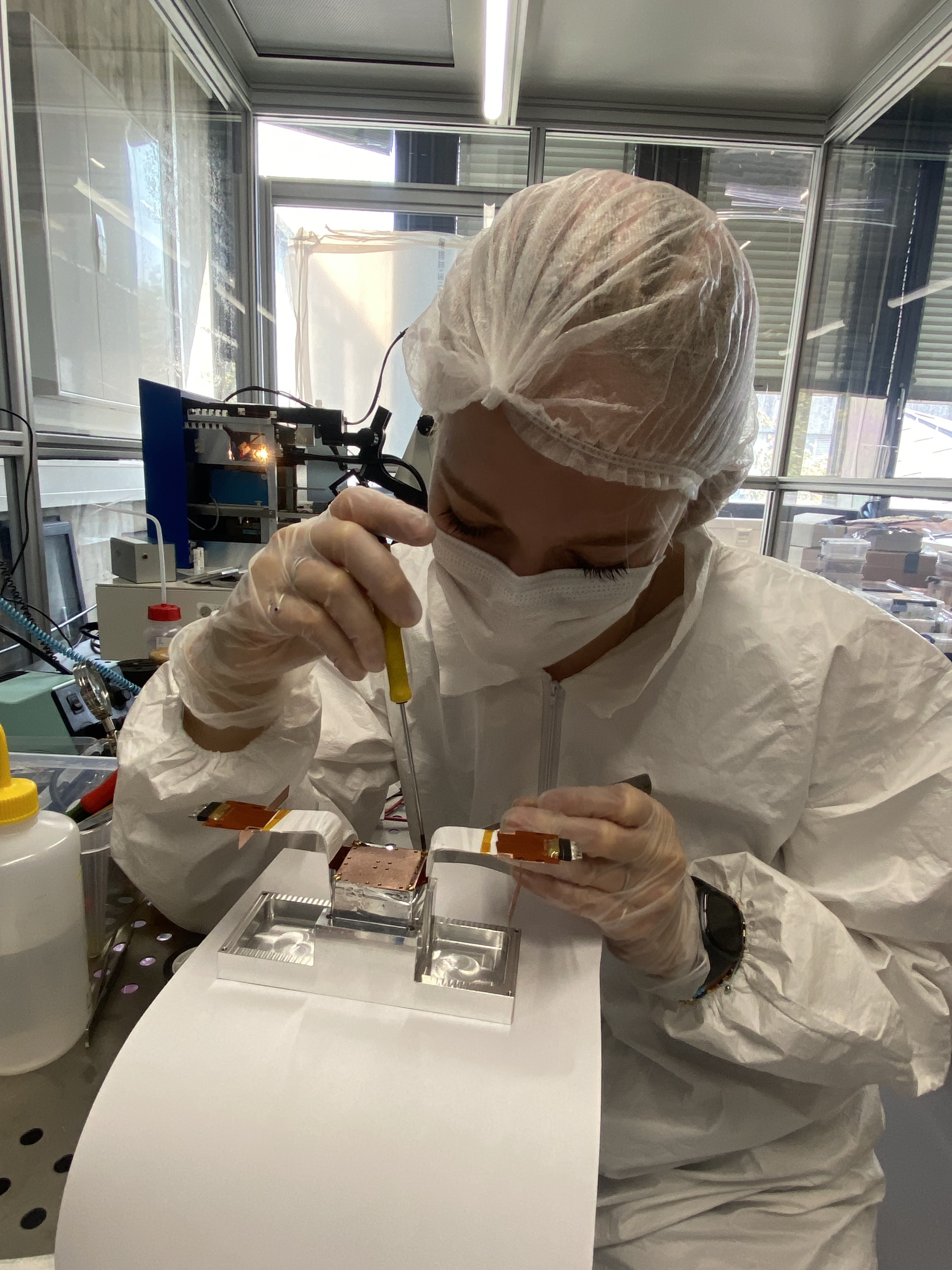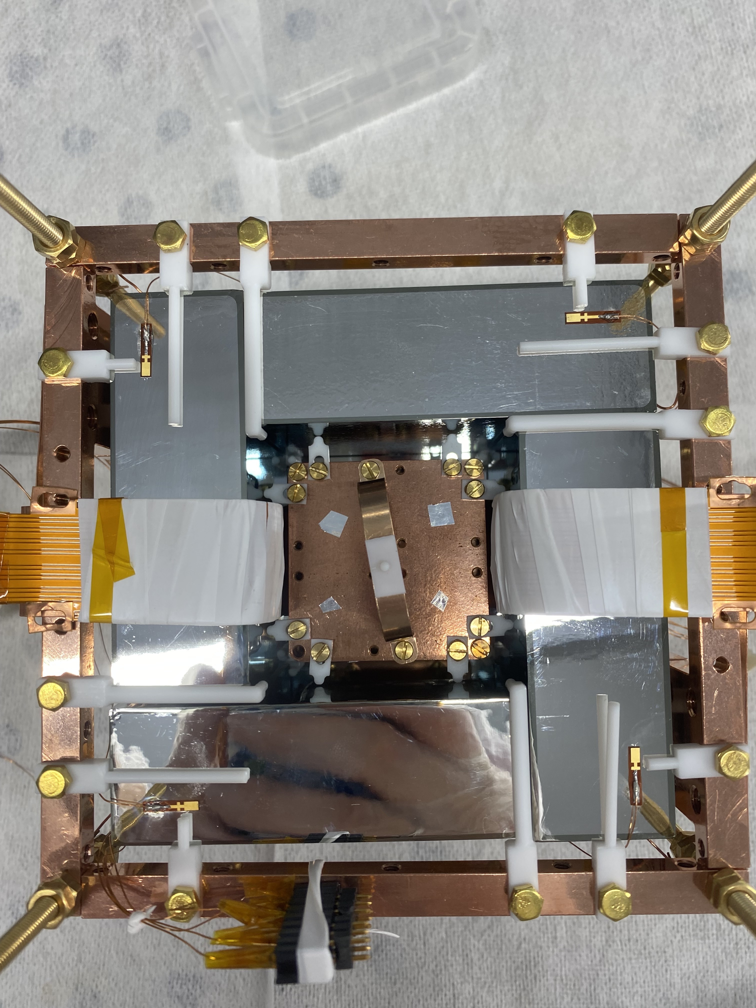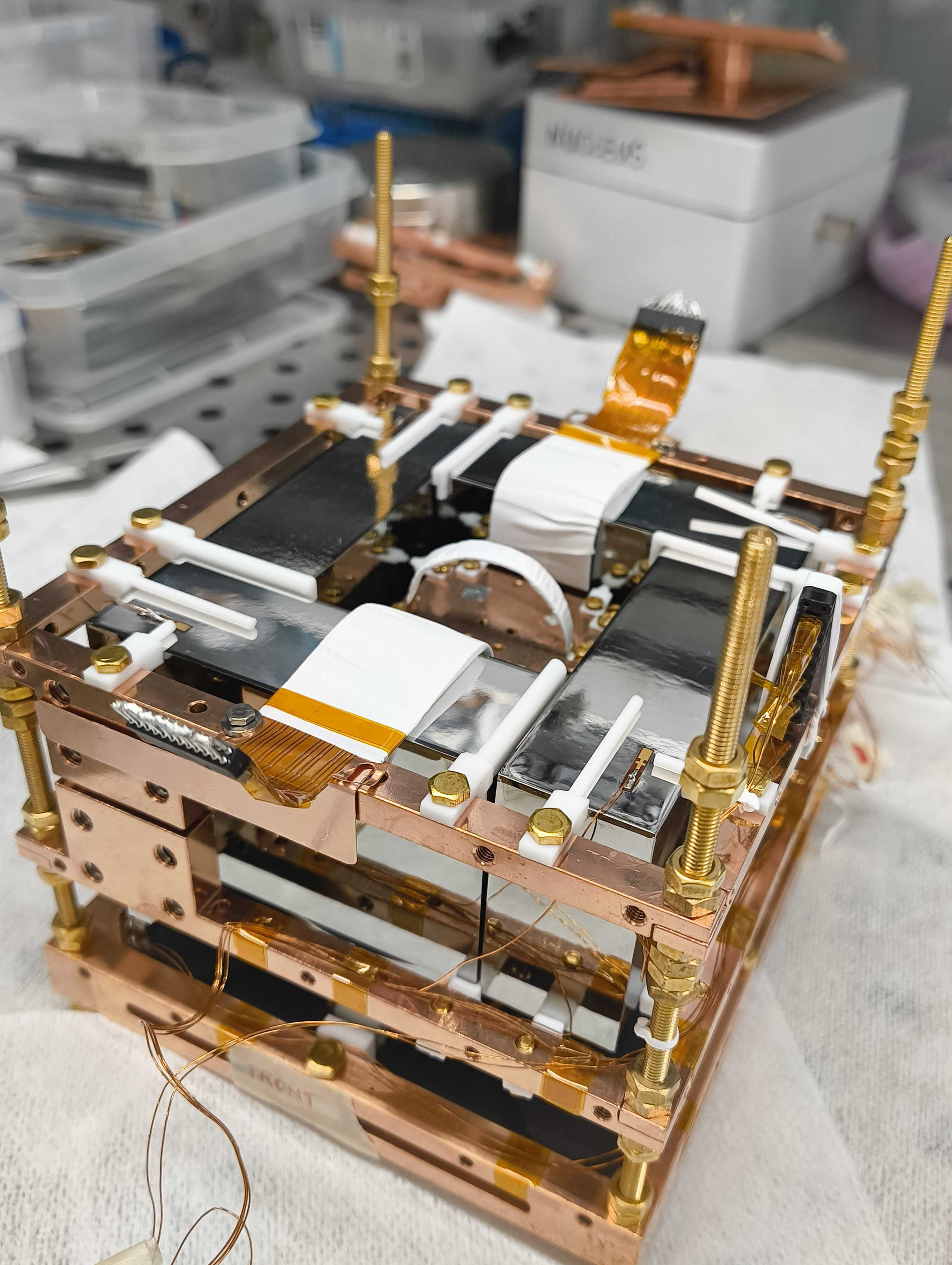 Now it's time to combine them together in a brand-new support structure, whose nickname within the collaboration is "the Cage”, equipped with a new thermalization system. The Cage serves as mechanical support for the six cryogenic outer veto's high-purity germanium crystals, which enclose the four CaWO4 detectors, each equipped with two Transition Edge Sensors.